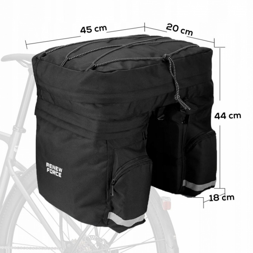 Taška na bicykl od Renew Force umožňuje splnit očekávání každého cyklisty. Pro zvýšení bezpečnosti jízdy zejména v noci a v náročných povětrnostních podmínkách je taška vybavena reflexními prvky a háčky na připevnění odrazek a světel. Celá byla vyrobena z nepromokavé látky, která ochrání prvky uvnitř během deště. Pohodlný přístup do komor a kapes zajišťují zipy a nastavitelné gumové síťky na klopně tašky nabízejí další prostor na připevnění láhve s vodou, bundy a mnoha dalších věcí.