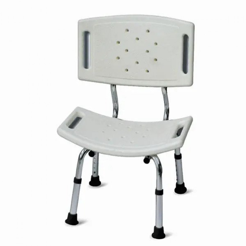 Výškově nastavitelná sprchová stolička s opěradlem, protiskluzovými nohami a bočními madly pro lepší stabilitu. Lehká, odolná a vhodná pro osoby se sníženou pohyblivostí.