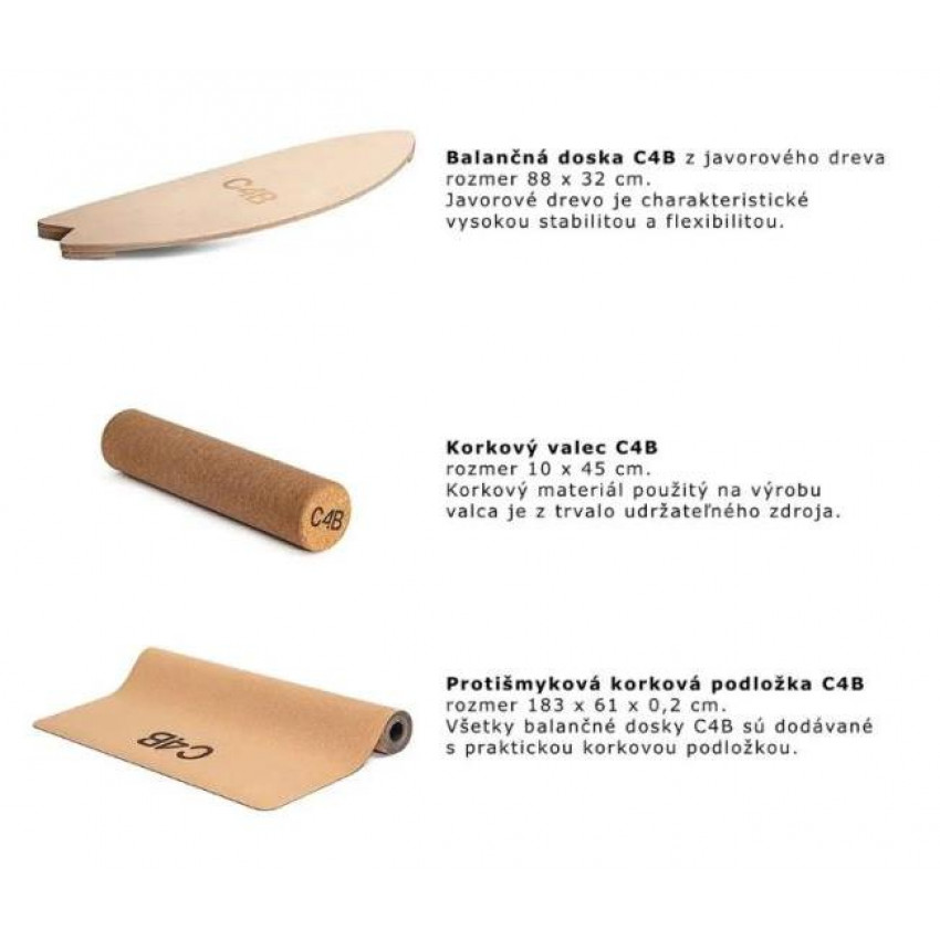 C4B Curved Balance Board Set obsahuje vše, co potřebujete pro maximální zábavu. Obsahuje zakřivenou balanční desku C4B ve vámi zvoleném designu, korkový válec na vyvážení desky a podložku na cvičení na jakémkoli povrchu nebo podlaze.